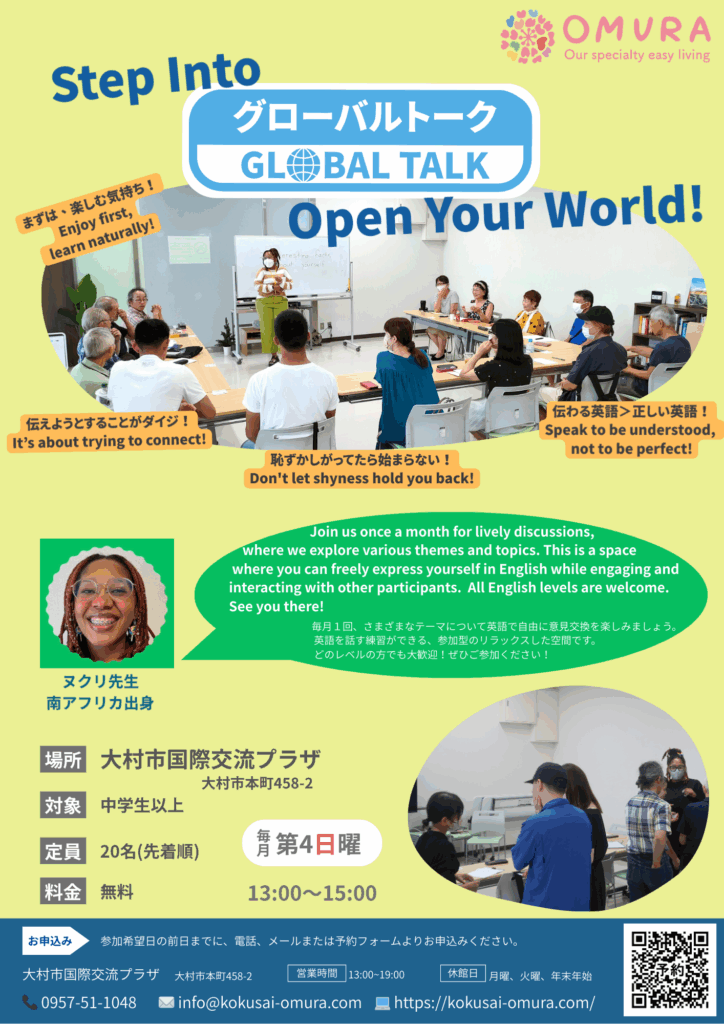 グローバルトークは、毎月テーマについて英語で話し、参加者同士で自由に意見を交わしながら、考えを深めたり新たな視点を得るイベントです。