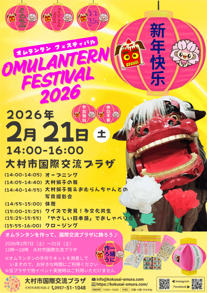 大村獅子の舞、大村獅子舞とおむらんちゃんとの写真撮影会、多文化共生クイズ、「やさしい日本語」でおしゃべりタイム